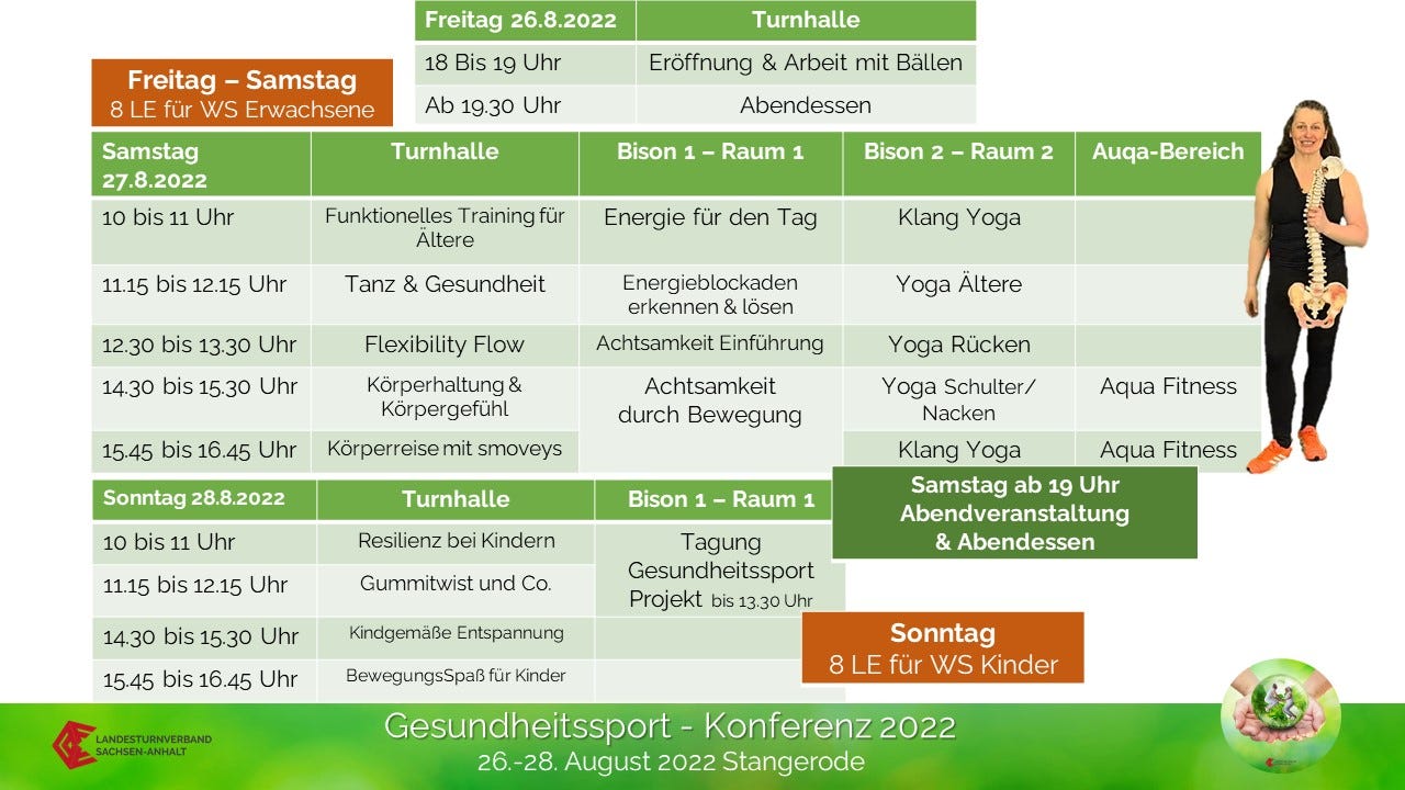 Klicke bitte auf den Button in der Mitte des Bildes und Du startest das Video mit der Vorstellung der Gesundheitssportkonferenz vom 26.-28.8.2022 in Stangerode mit Praxisworkshops für Erwachsene und Kinder im Bereich Gesundheitssport.